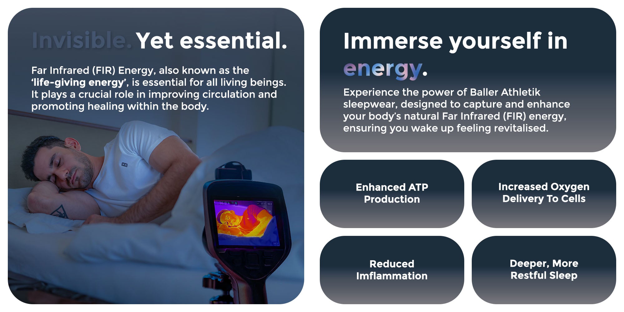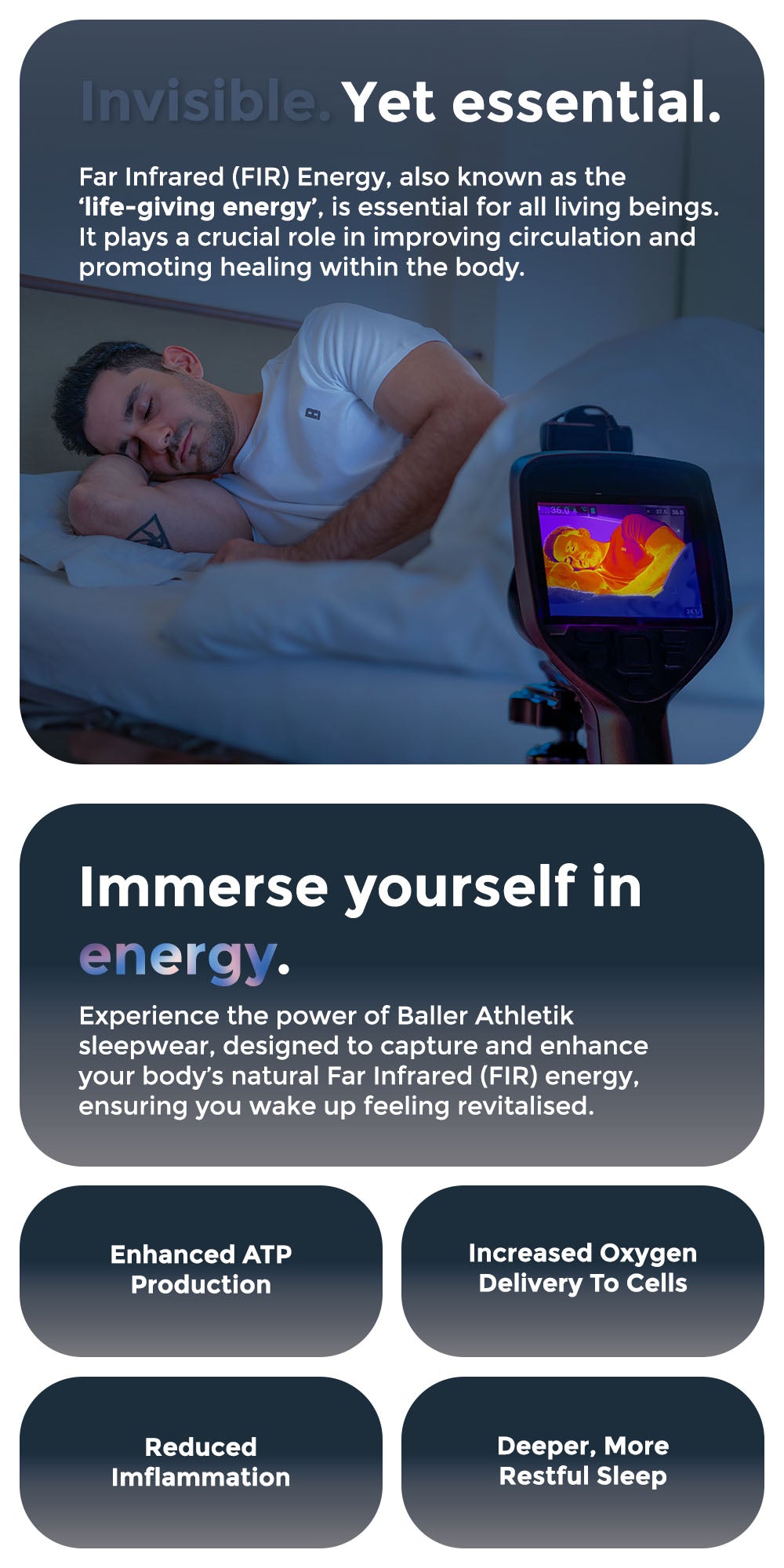 Far Infrared (FIR) technology harnesses the power of infrared light, a natural and safe form of energy that penetrates deep into the body's tissues. It stimulates cellular activity, improves blood circulation, and facilitates various health benefits. Our sports and sleepwear are infused with a proprietary matrix of Bioceramic minerals that can absorb and emit the Far Infrared energy that your body emits, resulting in biological advantages for you.