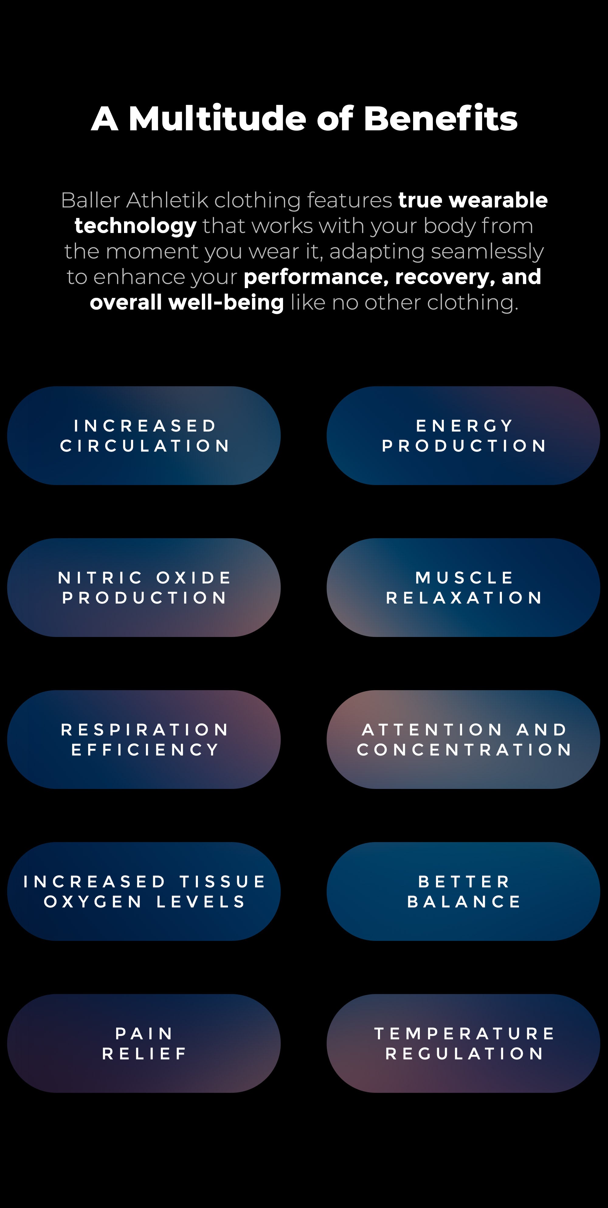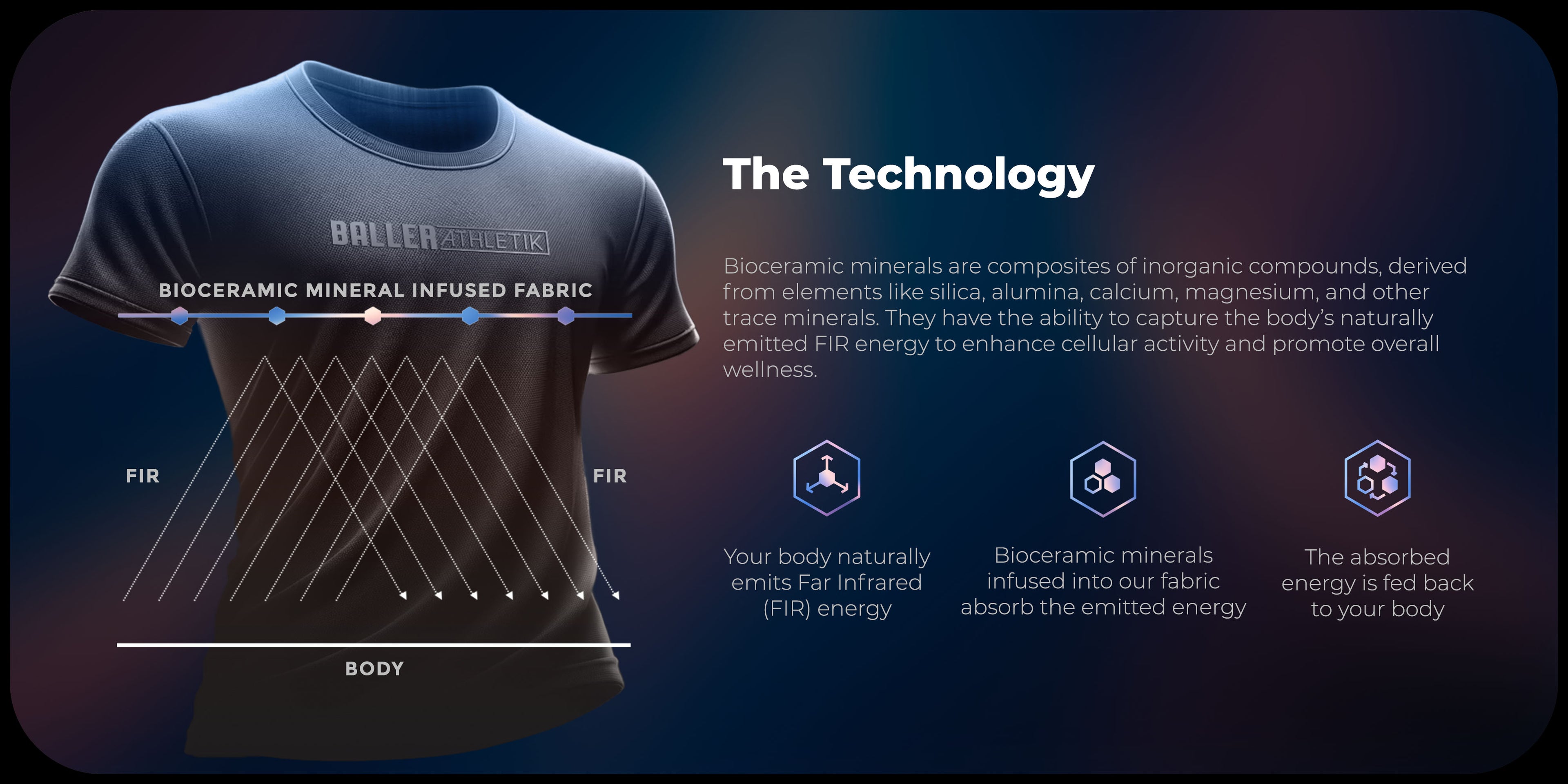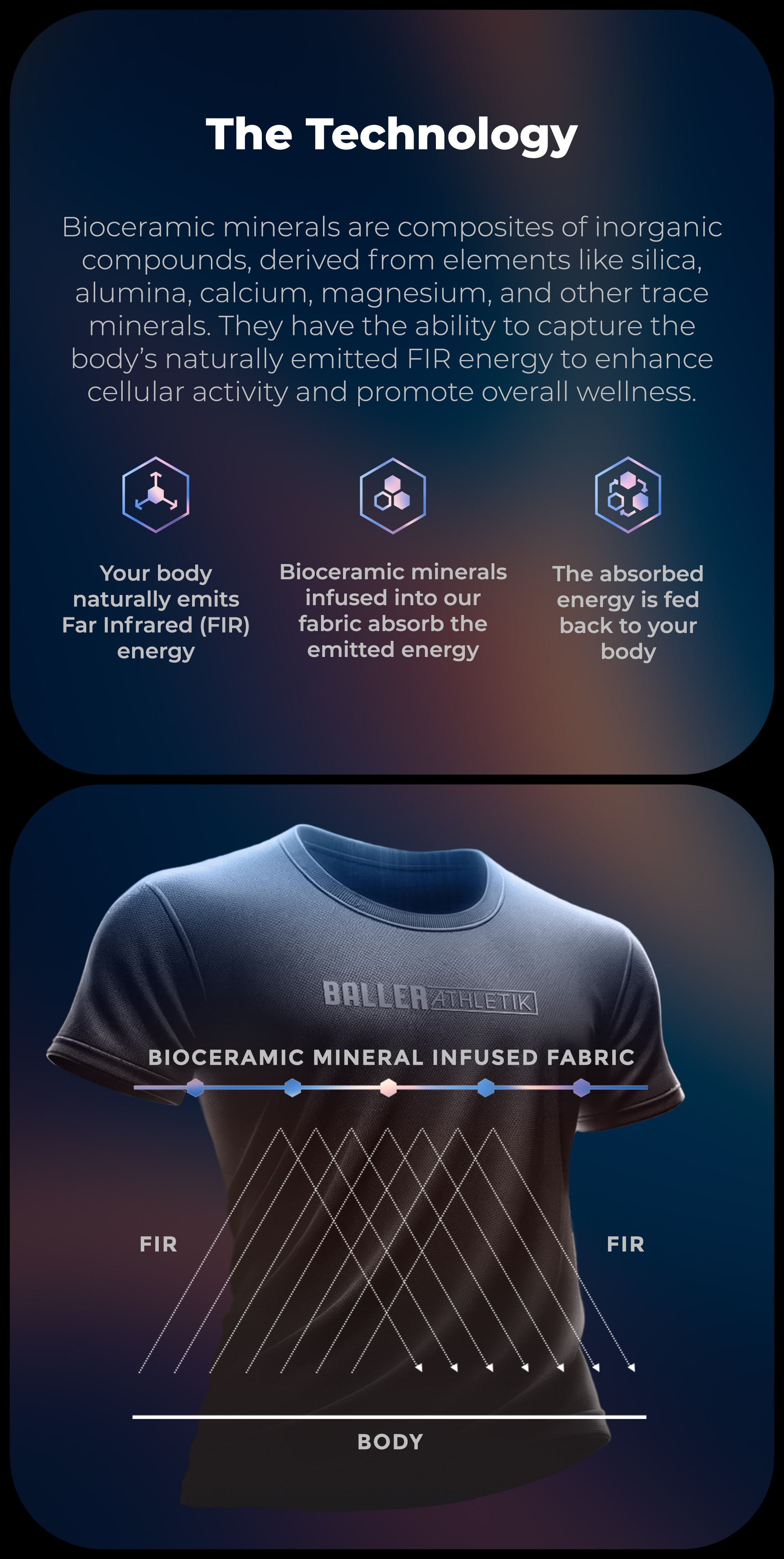 At Baller Athletik, we’ve created a game-changing product by infusing bioceramic minerals directly into the fabrics we use to create high quality performance, athleisure and sleepwear. These minerals absorb and emit FIR energy, enhancing your body’s natural processes. The amazing part of this unique technology is that it doesn't require any external power to work. It is powered by YOU — powered by the excess metabolic energy emitted by your body — that would otherwise be wasted.