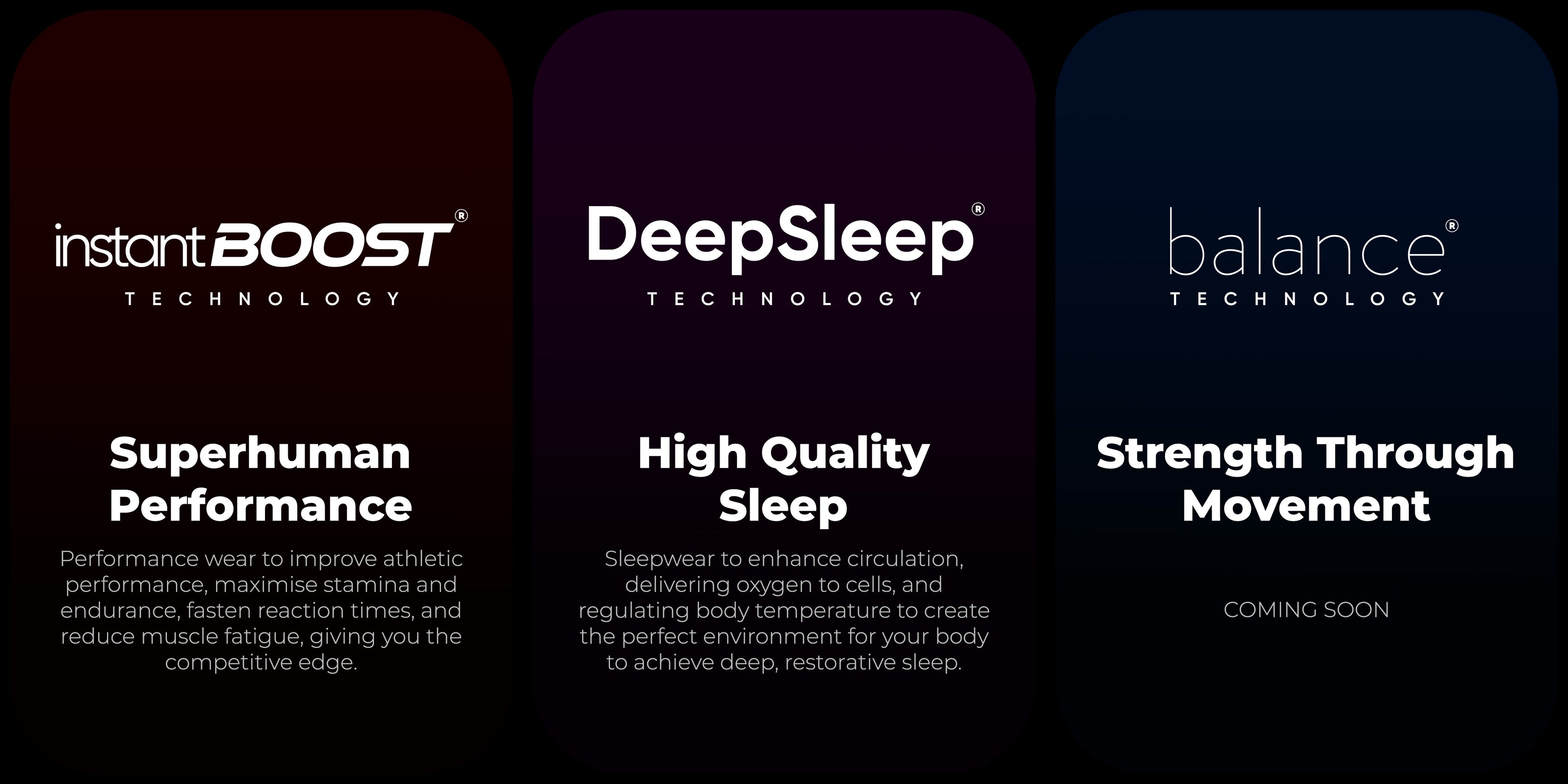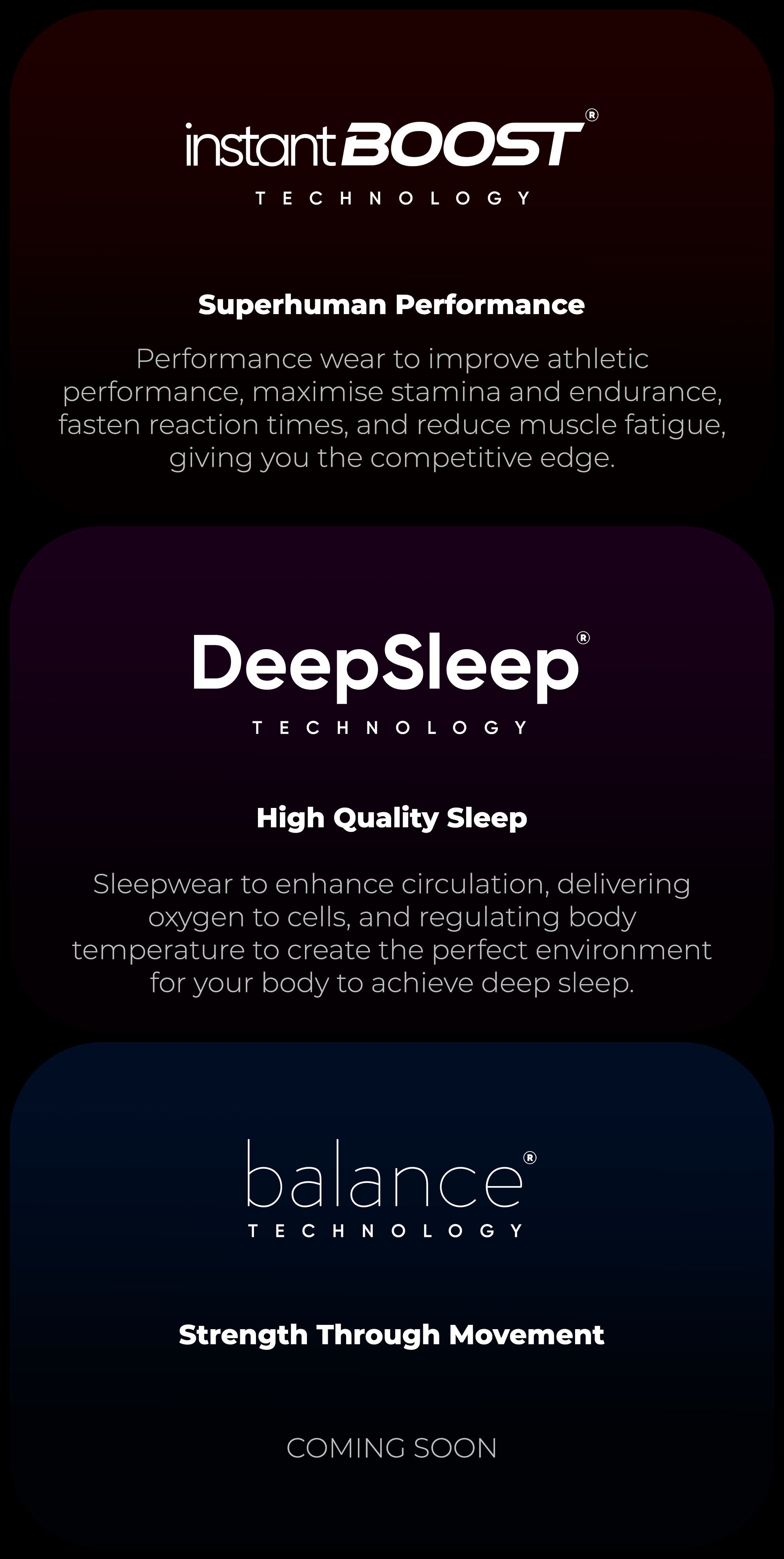 Wearable technology that works with your body to improve your performance, speed up recovery, and optimise sleep — all without the need for electronics or special devices. It (unobtrusively) actively increases your metabolic efficiency without any external intervention. It’s powerful clothing that doesn’t just meet your needs, but actively works to enhance your life.
