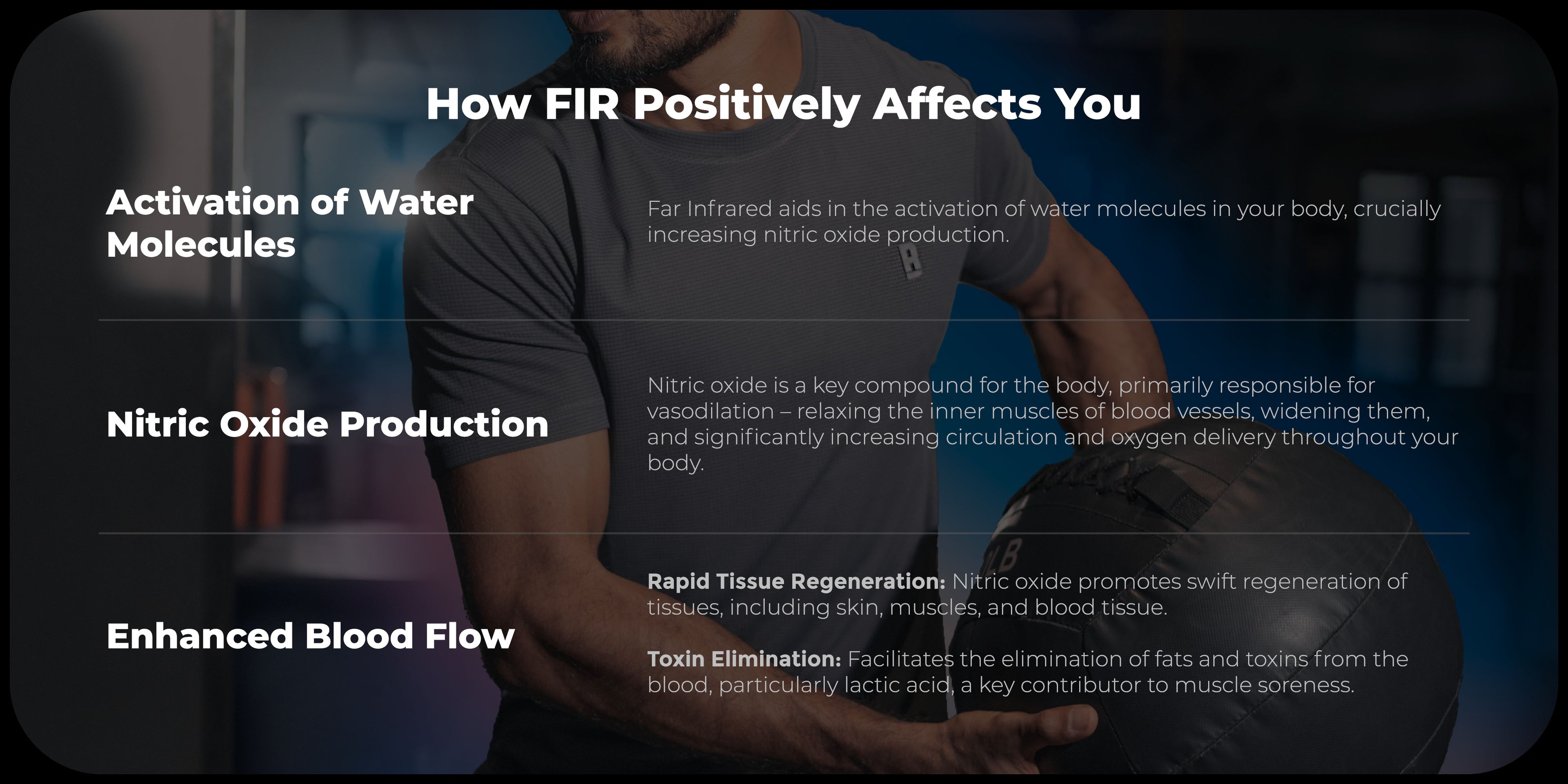 Far Infrared (FIR) energy is a gentle, radiant heat naturally emitted by the sun, the environment, and even your own body. Every human emits FIR energy as part of metabolic activity, and this energy plays a critical role in supporting circulation and cellular function. Almost 60% of the energy metabolised in our cells is lost in the form of FIR energy – showing there is a great inefficiency in how our body generates energy.